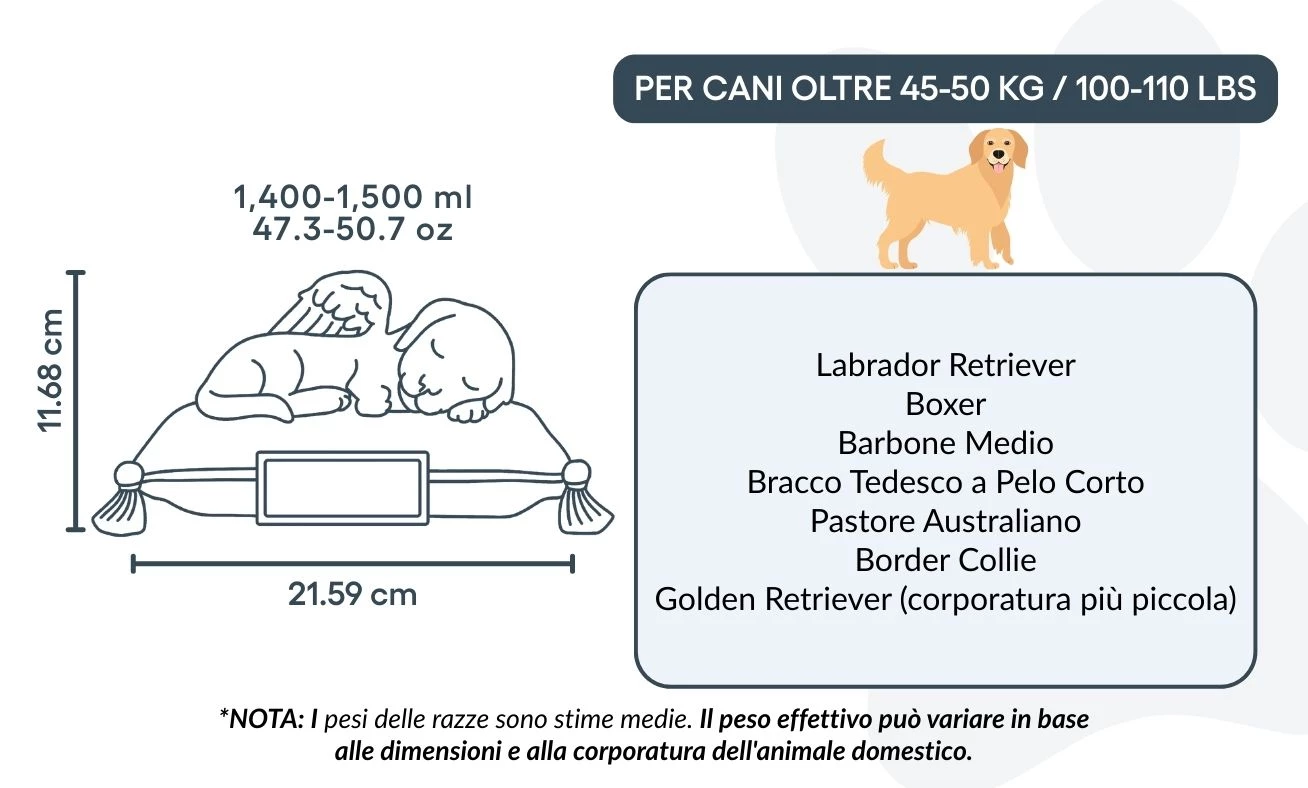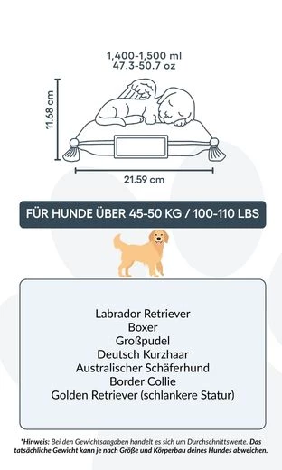 Größe / Urnenkapazität: 21,59 cm (L) × 19,05 cm (B) × 11,68 cm (H) / 844 g | ca. 1.400–1.500 ml / 47,3–50,7 oz Für Tiere bis ca. 45–50 kg / 100–110 lbs