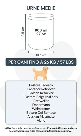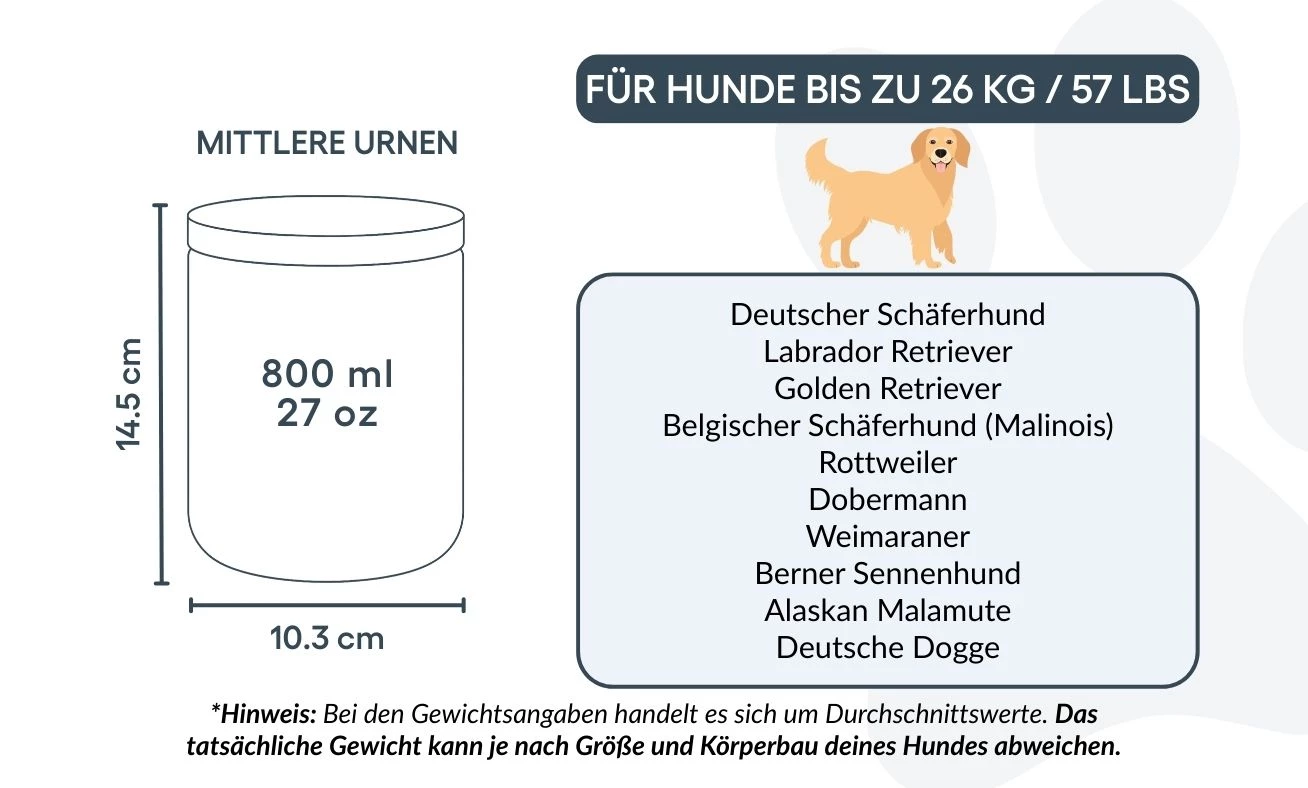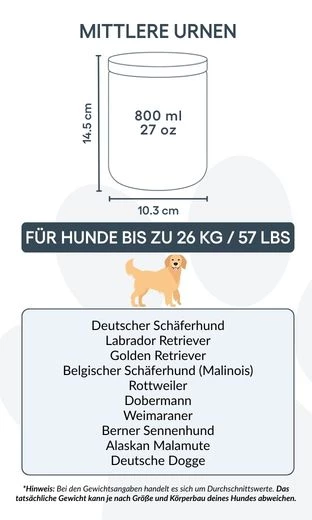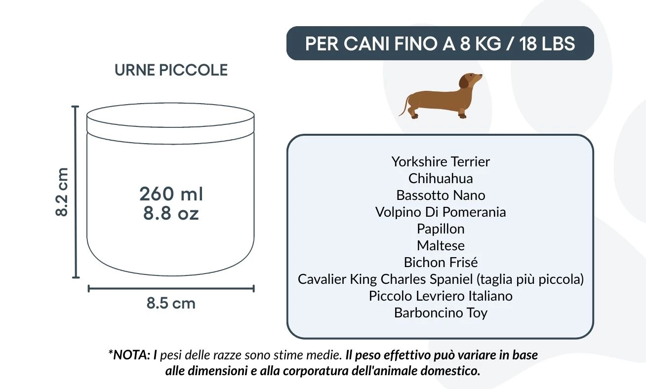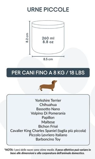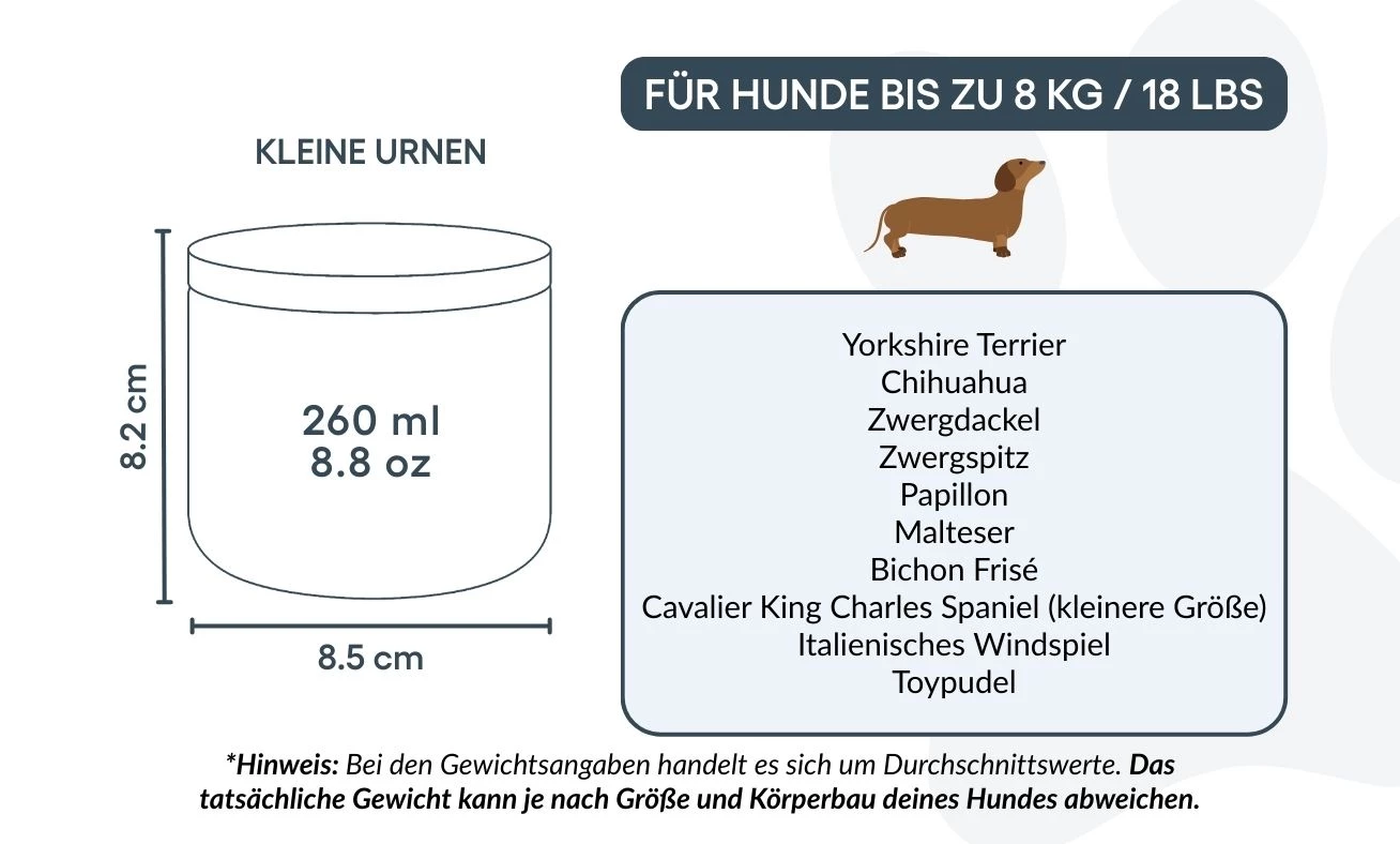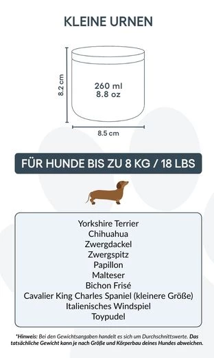Größen / Fassungsvermögen der Urne: Klein: 8,5 cm (B) x 8,2 cm (H) x 8,5 cm (L) | 260 ml / 8.8 oz Für Hunde bis 8 kg / 18 lbs Typische Rassen: Zwergspitz (Pomeranian), Chihuahua, Toy-Pudel