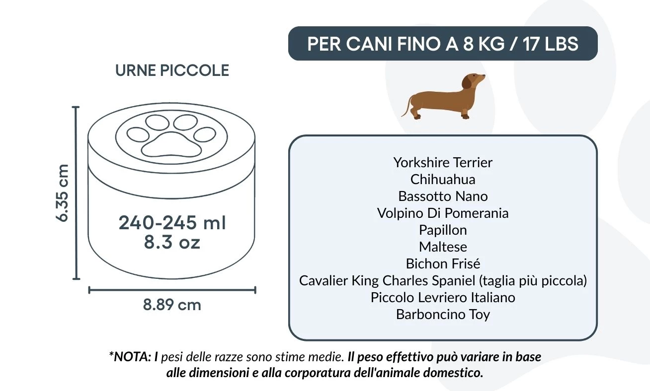 Größe / Fassungsvermögen der Urne: 8,89 cm (B) x 6,35 cm (H) x 8,89 cm (L): 240–245 ml / 8.3 oz Für Hunde bis 8 kg / 17 lbs Typische Rassen: Yorkshire Terrier, Pekinese, Zwerg-Dackel, Toy-Pudel