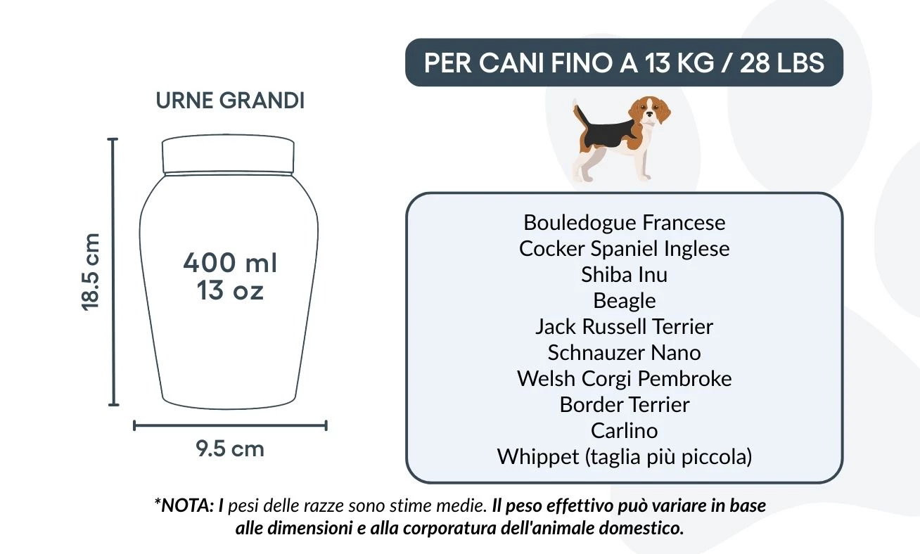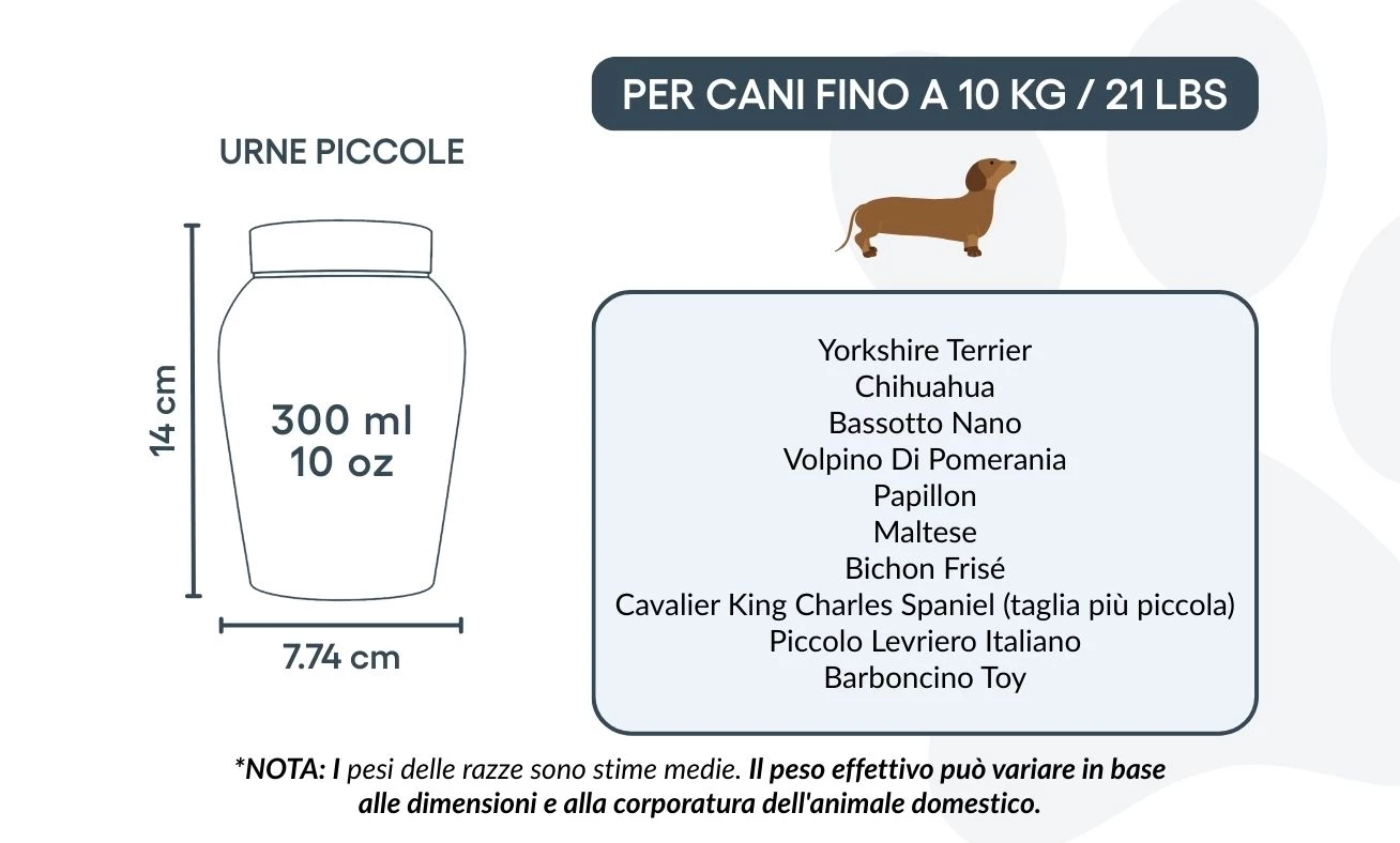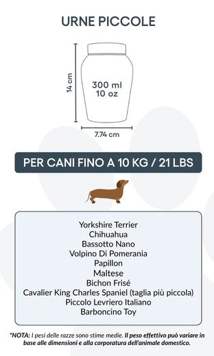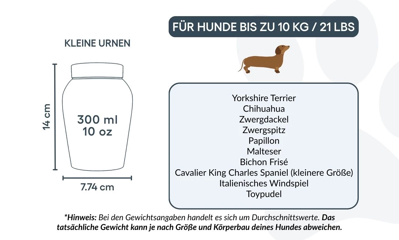 Größen / Fassungsvermögen der Urne: Klein: 7,74 cm (B) x 14 cm (H) x 7,74 cm (L) | 300 ml / 10 oz – geeignet für Hunde bis 10 kg / 21 lbs Typische Rassen: Pomeranian, Shih Tzu, Bichon Frisé, Zwergdackel