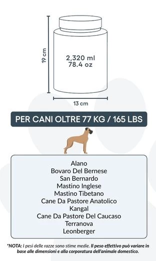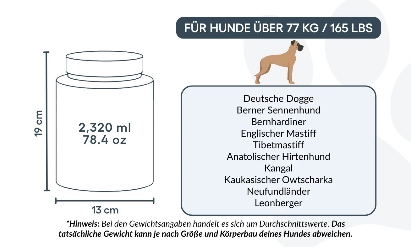 13 cm (B) x 19 cm (H) x 13 cm (L) | ca. 2.320 ml / 78,4 oz – geeignet für Hunde bis ca. 77 kg / 165 lbs