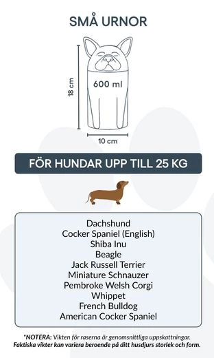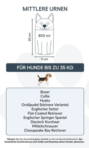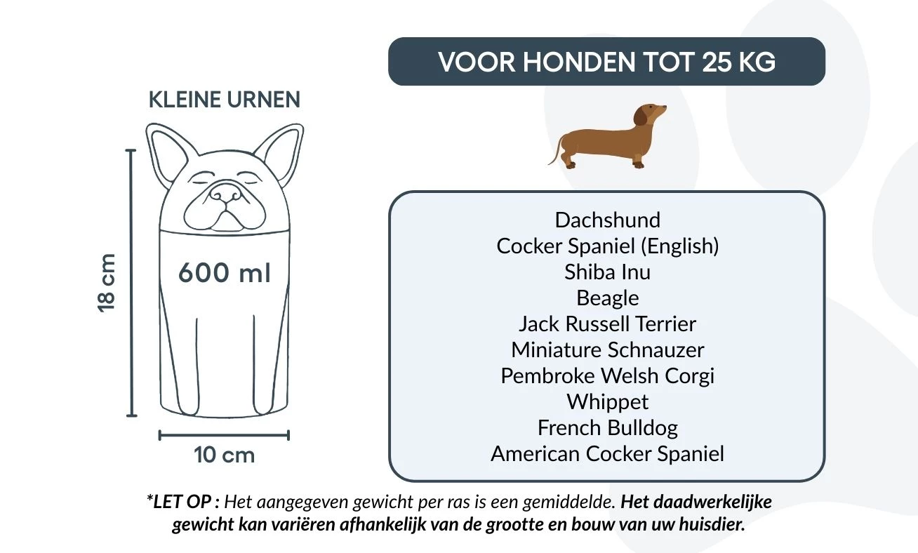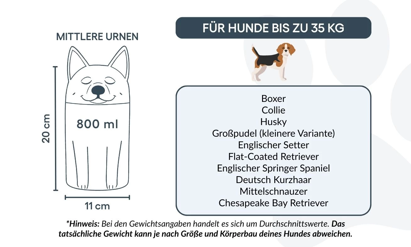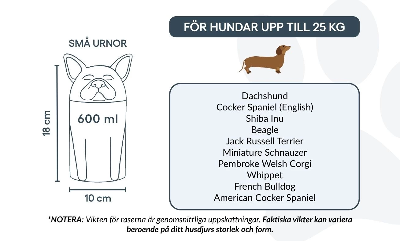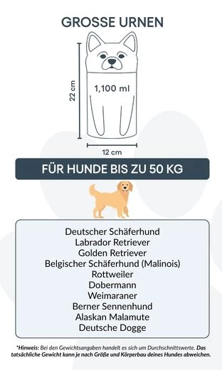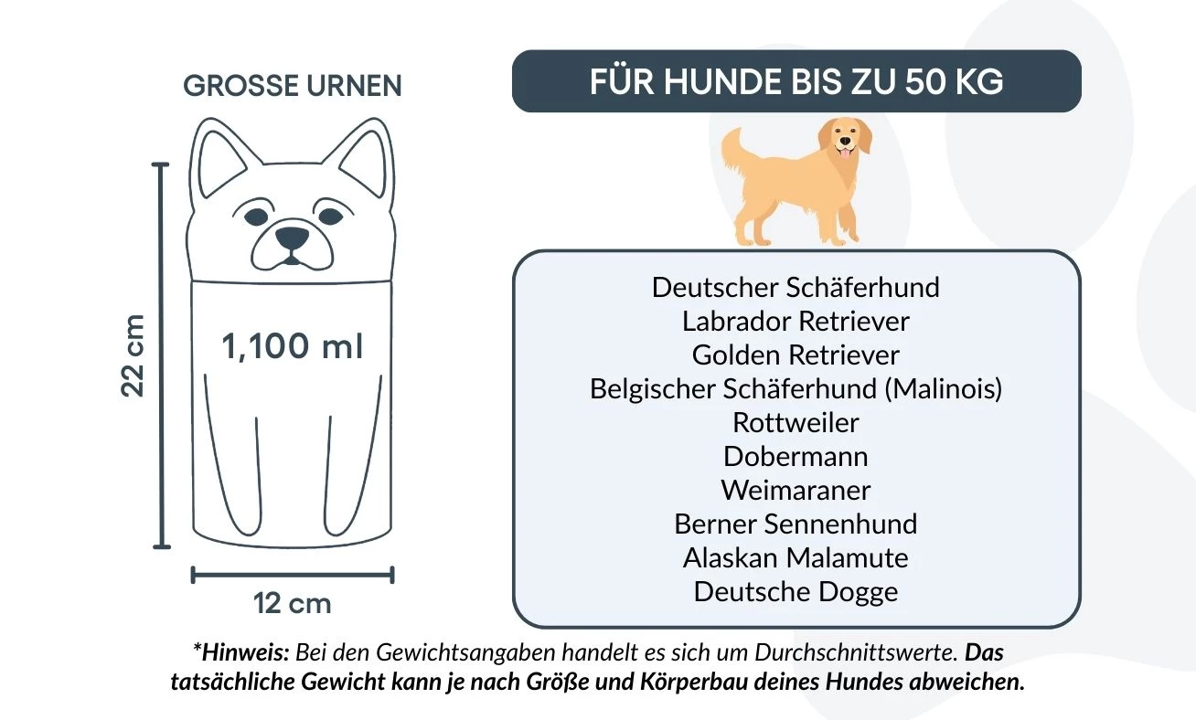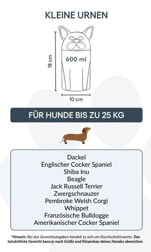 Hinweis: Die Volumenangaben basieren auf durchschnittlichen Ergebnissen nach der Kremation. Bitte berücksichtigen Sie Gewicht und Statur Ihres Tieres bei der Auswahl der passenden Größe.