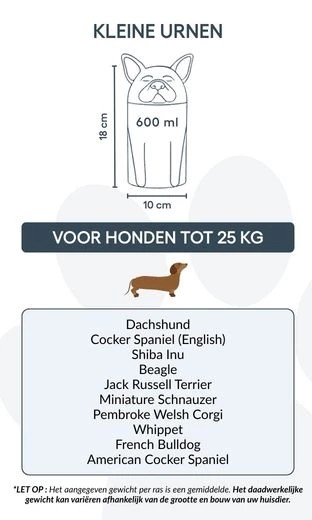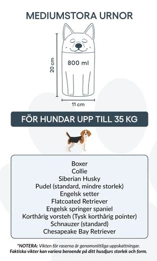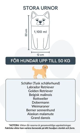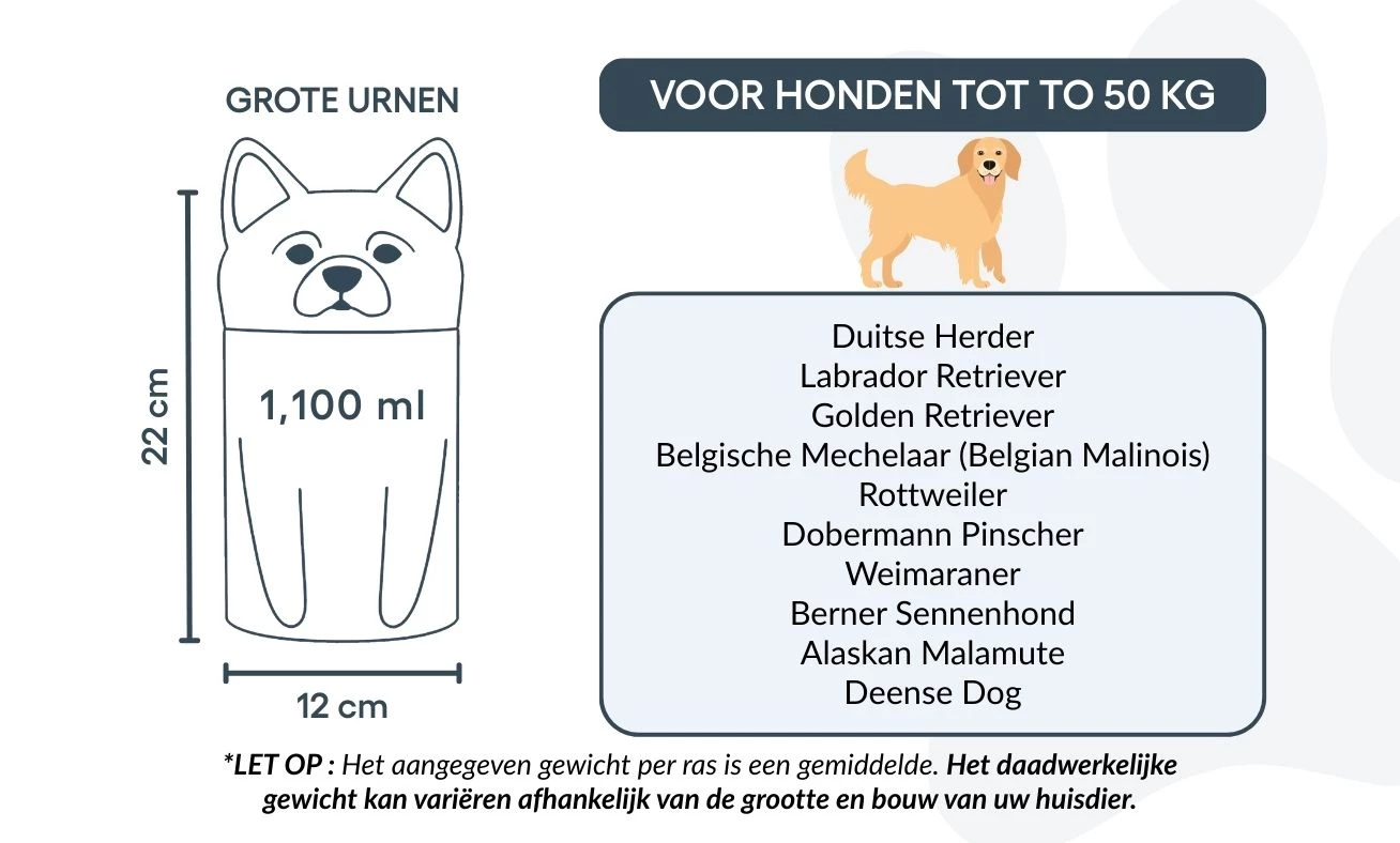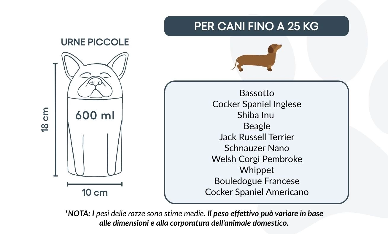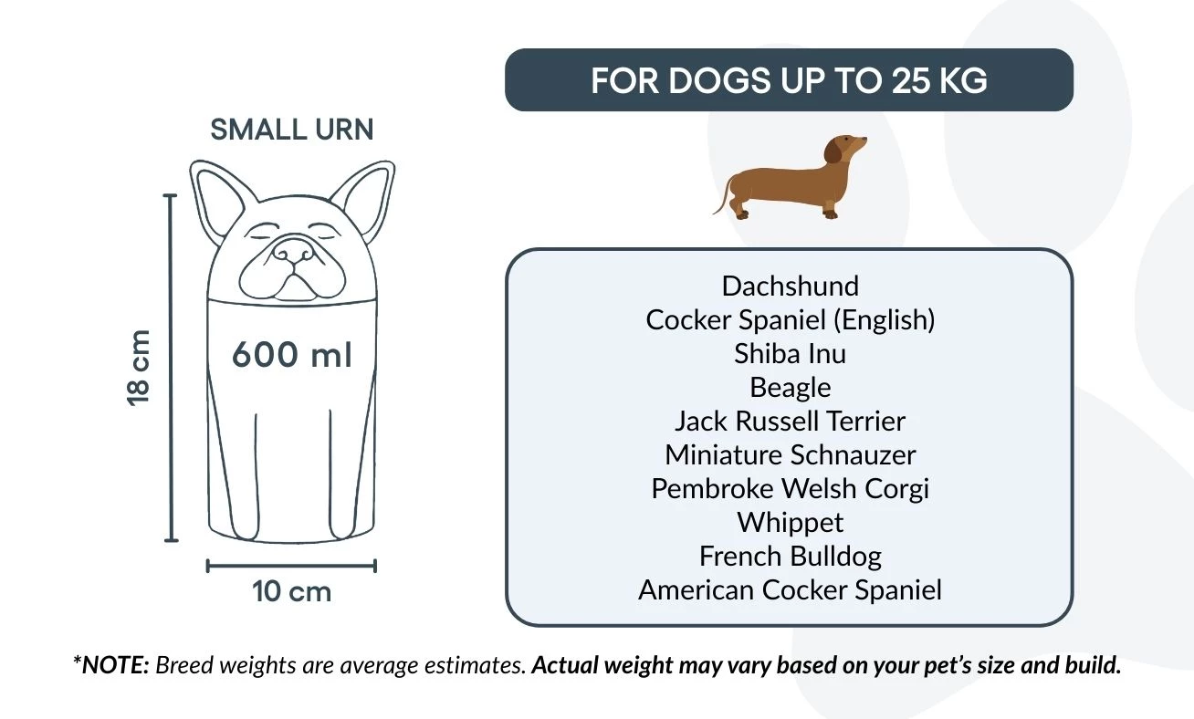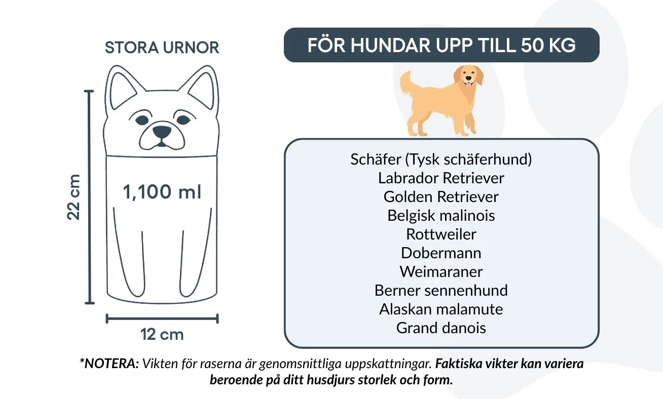 Hinweis: Die Volumenangaben basieren auf durchschnittlichen Ergebnissen nach der Kremation. Bitte berücksichtigen Sie Gewicht und Statur Ihres Tieres bei der Auswahl der passenden Größe.