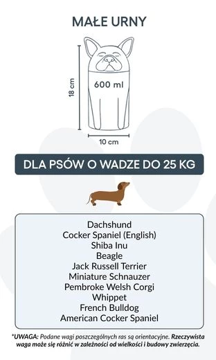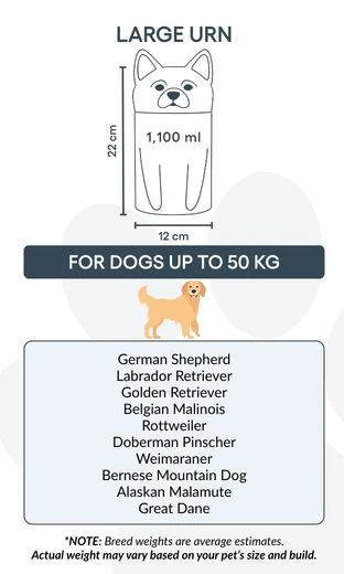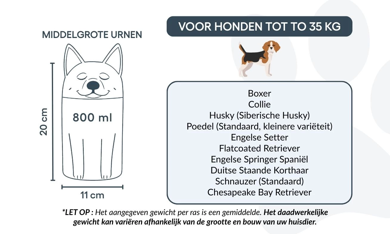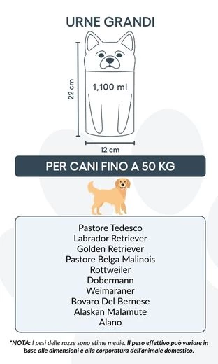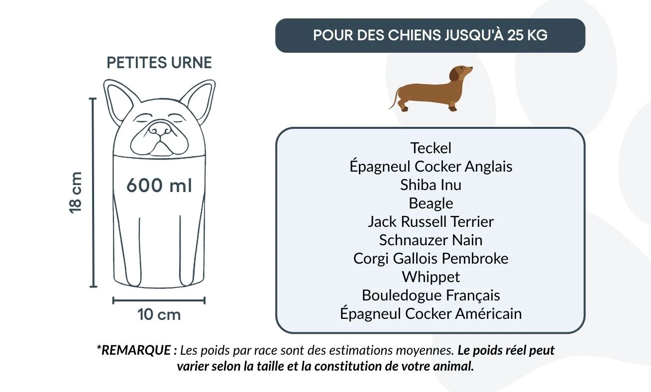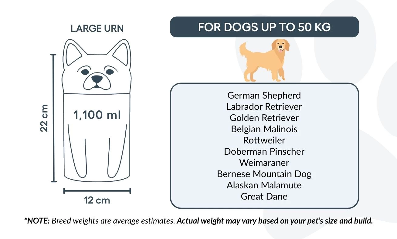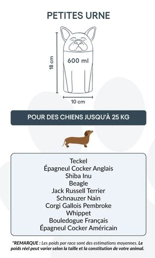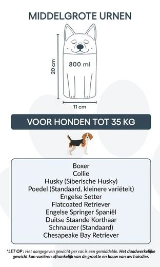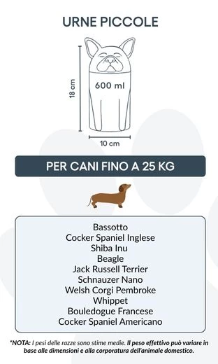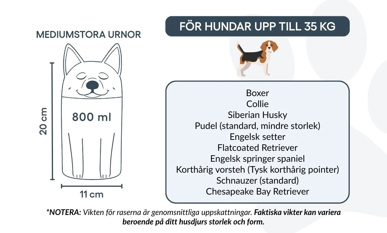 Hinweis: Die Volumenangaben basieren auf durchschnittlichen Ergebnissen nach der Kremation. Bitte berücksichtigen Sie Gewicht und Statur Ihres Tieres bei der Auswahl der passenden Größe.