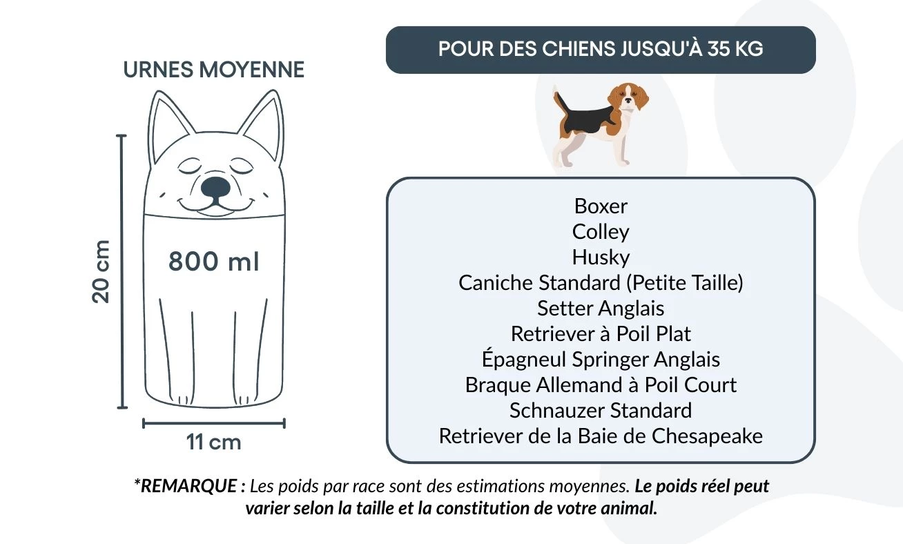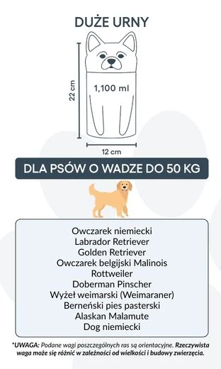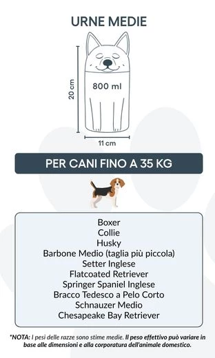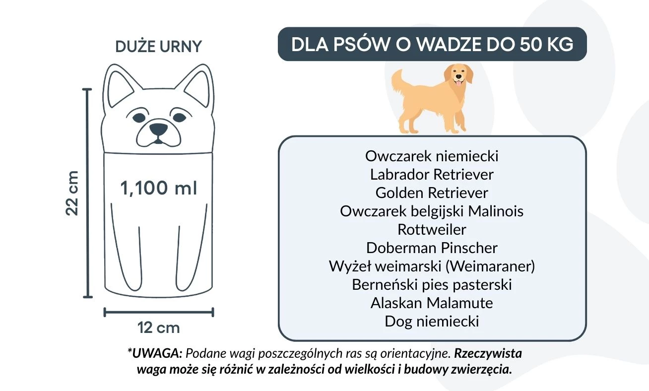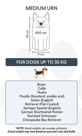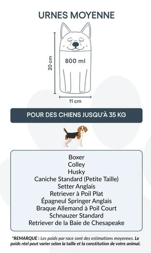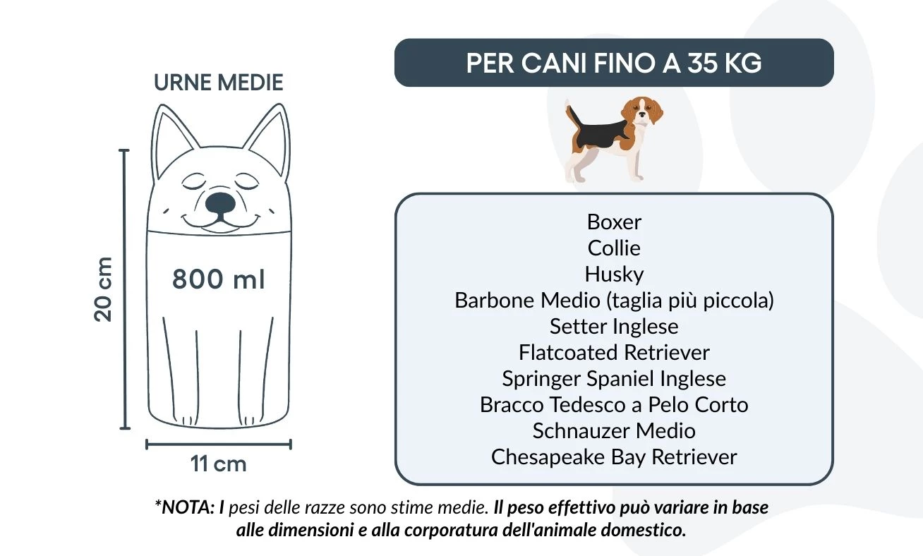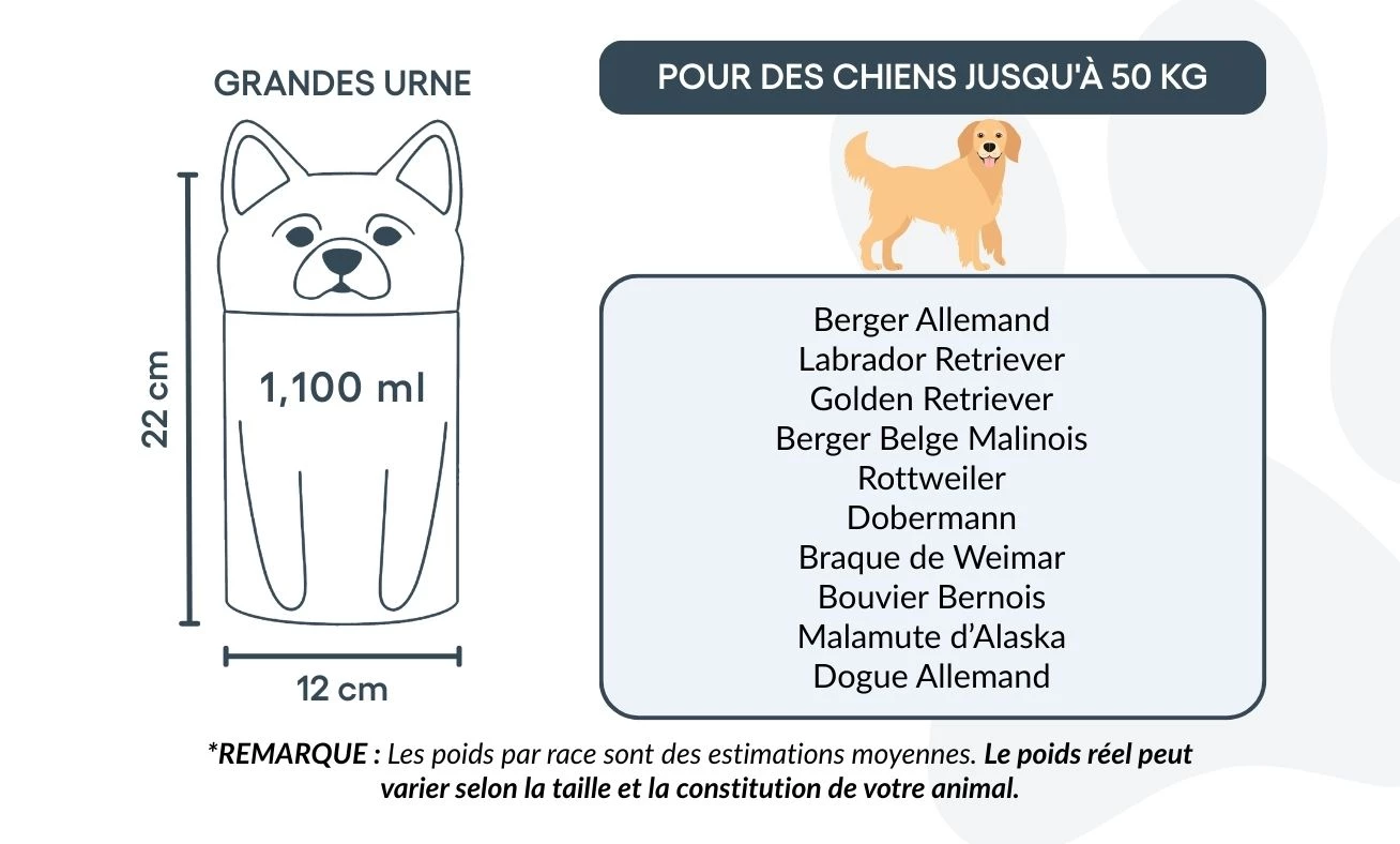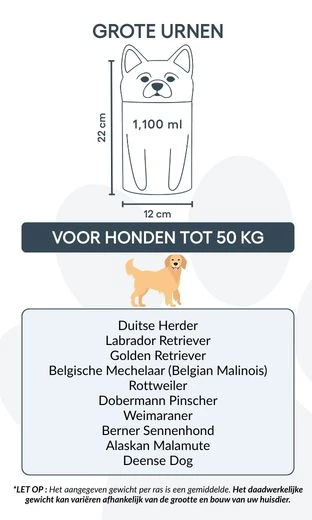 Hinweis: Die Volumenangaben basieren auf durchschnittlichen Ergebnissen nach der Kremation. Bitte berücksichtigen Sie Gewicht und Statur Ihres Tieres bei der Auswahl der passenden Größe.