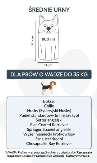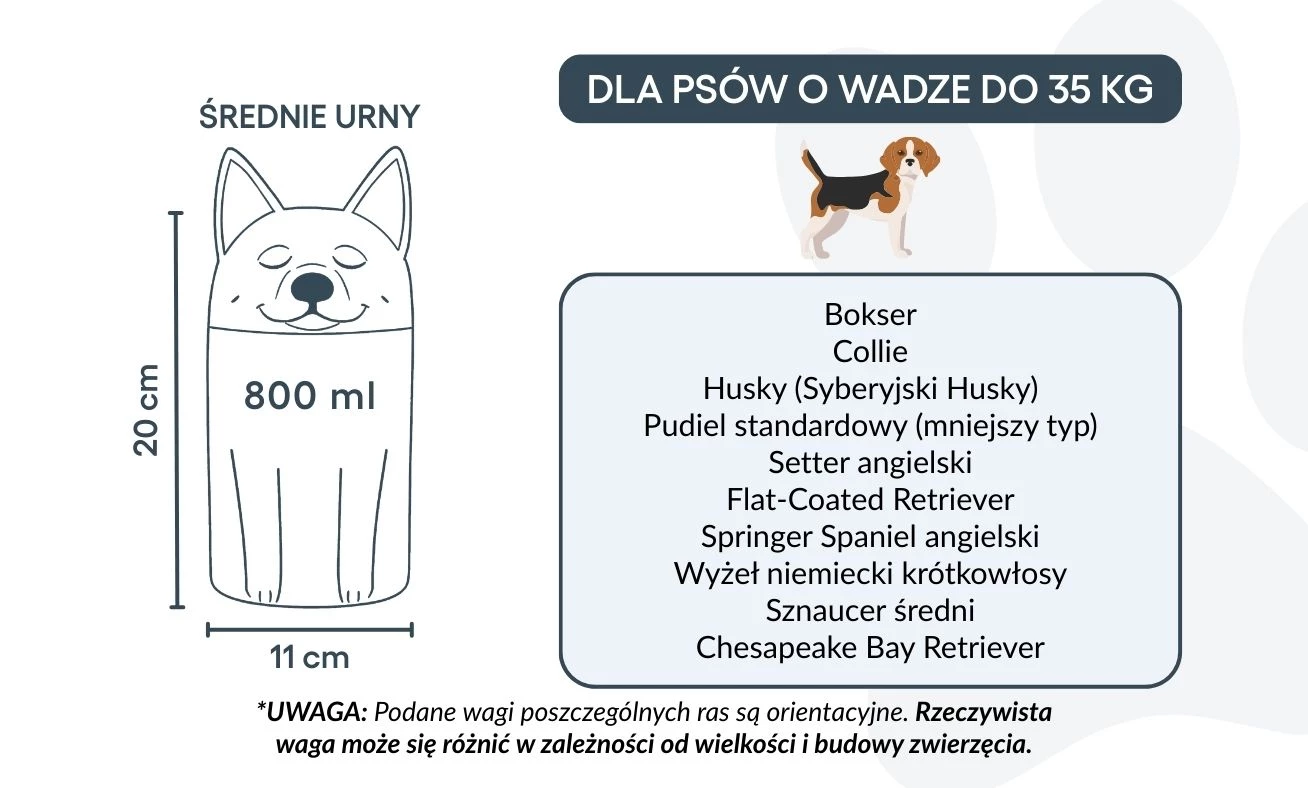 Erhältlich in drei Größen für Hunde bis 50 kg, bietet diese personalisierte Tierurne aus Keramik ausreichend Platz für die Asche sowie für eine persönliche Beschriftung. Die sorgfältig geformte und sicher verschließbare Gestaltung sorgt für eine geschützte Aufbewahrung und eine stilvolle Präsentation im Innenbereich.