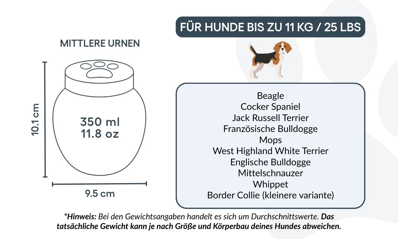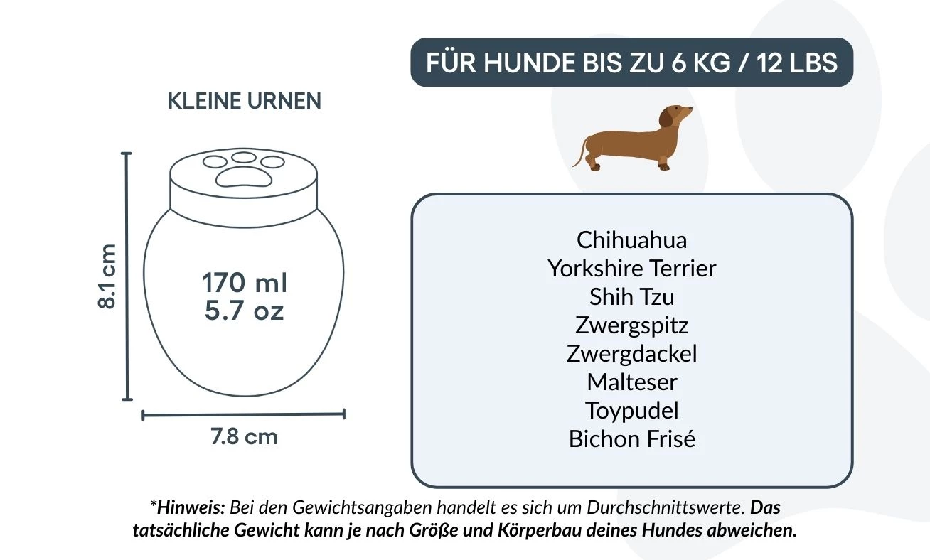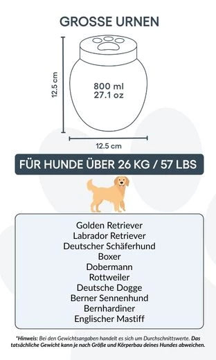 Sie können Ihre Urne individuell personalisieren – mit dem Namen Ihres Hundes, wichtigen Daten und einem optionalen Symbol. So entsteht ein Unikat, das die besondere Verbindung zu Ihrem Haustier widerspiegelt. Die glatte, hochwertige Oberfläche und der sichere Deckel vereinen Ästhetik und Funktionalität – ideal für die Aufbewahrung im Innenbereich.