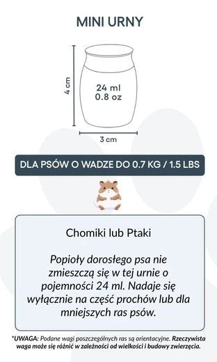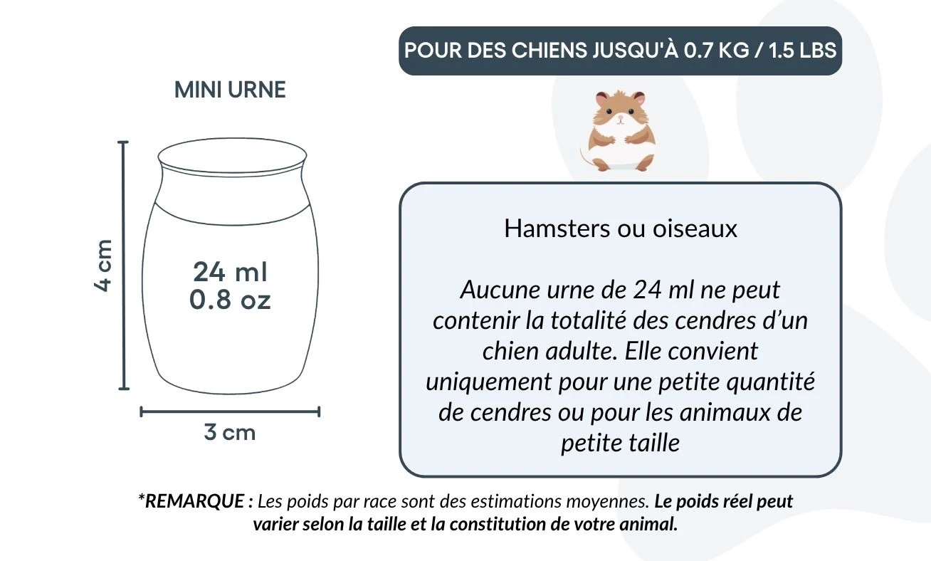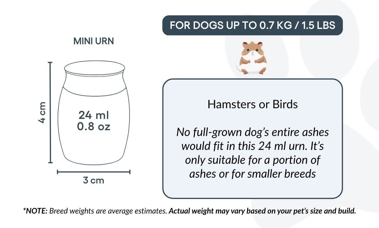 Taille / Capacité de l’urne : 3 cm (L) × 4 cm (H) × 3 cm (P) | 24 ml Profondeur : 25 mm | Diamètre du couvercle : 25 mm | Diamètre de la base : 22 mm Convient pour : hamsters, petits oiseaux, ou une partie des cendres d’un chien de plus grande taille.