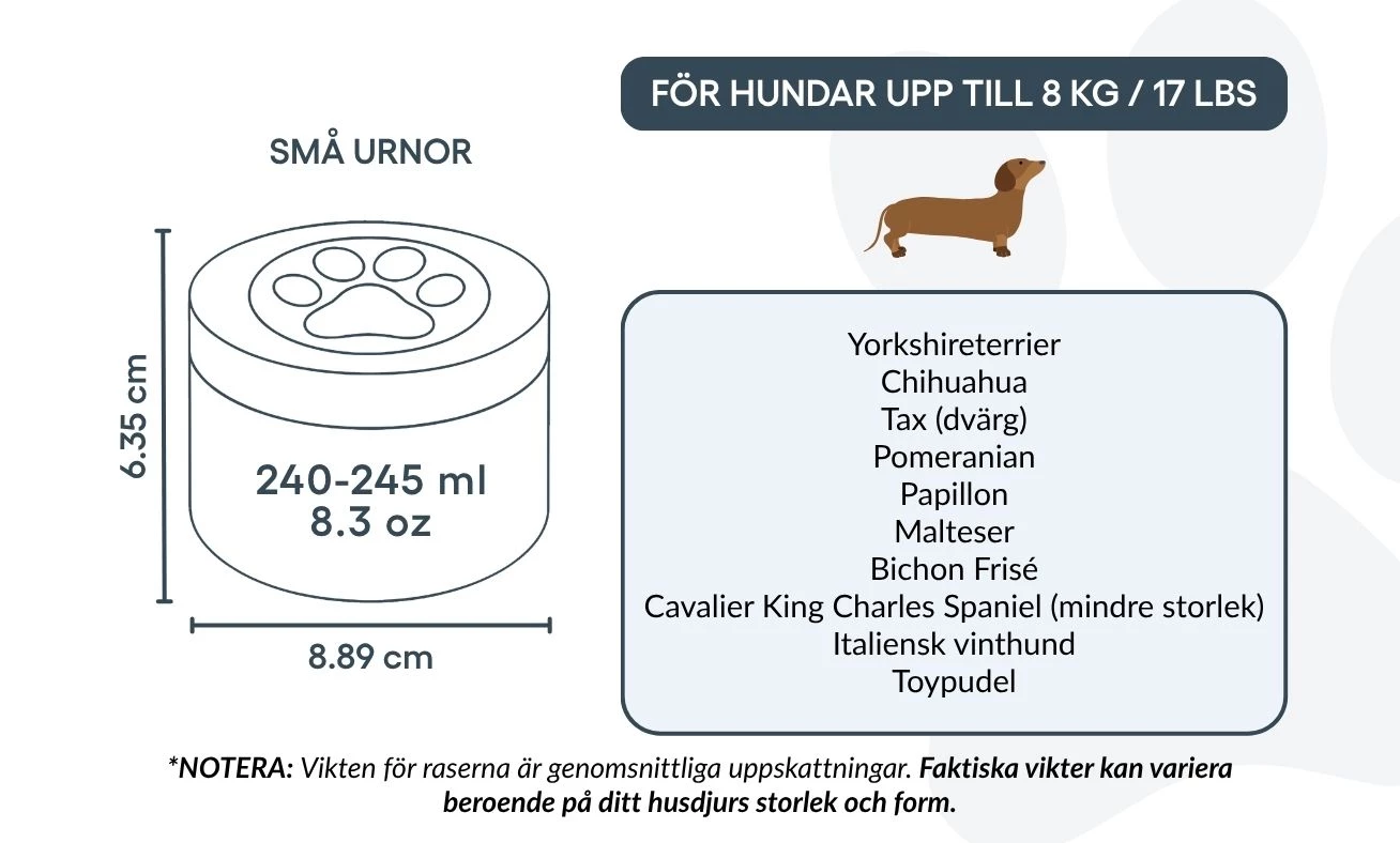 Cette urne commémorative convient parfaitement aux chiens jusqu’à 8 kg, mais peut également être utilisée pour préserver une partie symbolique des cendres d’un animal plus grand — pour partager le souvenir avec vos proches ou créer plusieurs souvenirs personnalisés. Elle permet ainsi de garder une part de votre compagnon tout près de vous, de manière intime et respectueuse.
